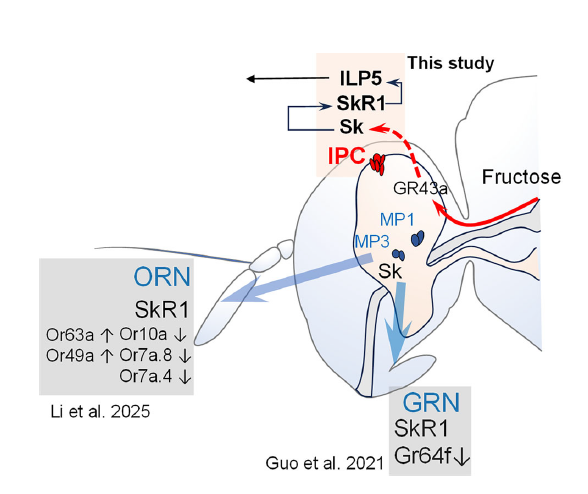基于以上研究,团队首次提出fructose-Gr43a-Sk-SkR1-ILP5 摄食调控通路:橘小实蝇取食营养性糖分后,血淋巴果糖升高被Gr43a感知,激活Sk-ILP神经元释放Sk,Sk结合SkR1后促进ILP5表达,最终传递饱腹信号抑制摄食,而该通路对无热量的非营养糖无响应,证实其为依赖营养感知的特异性调控通路。