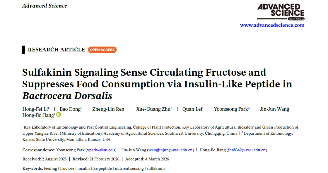 近日,学院王进军教授团队在橘小实蝇摄食行为调控机制研究领域取得新进展,研究发现神经肽Sulfakinin(Sk)信号通路通过感知血淋巴中果糖水平,经胰岛素样肽介导形成摄食抑制的饱腹信号通路,为解析昆虫营养感知与摄食行为的调控网络提供了全新视角。相关研究成果以“Sulfakinin signaling sense circulating fructose and suppresses food consumption via insulin-ASlike peptide in Bactrocera dorsalis”为题发表于Advanced Science。