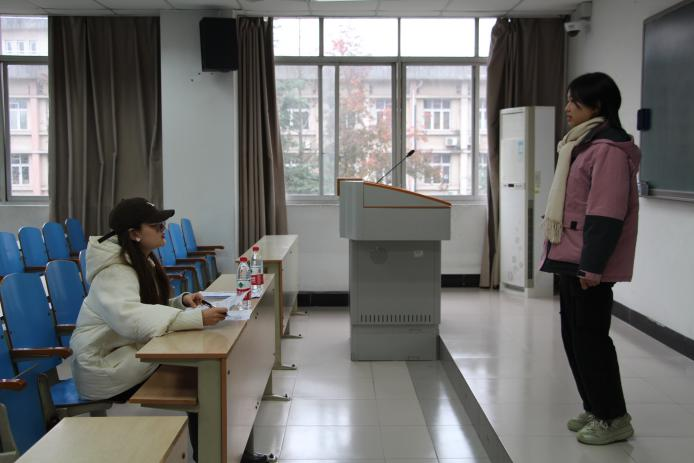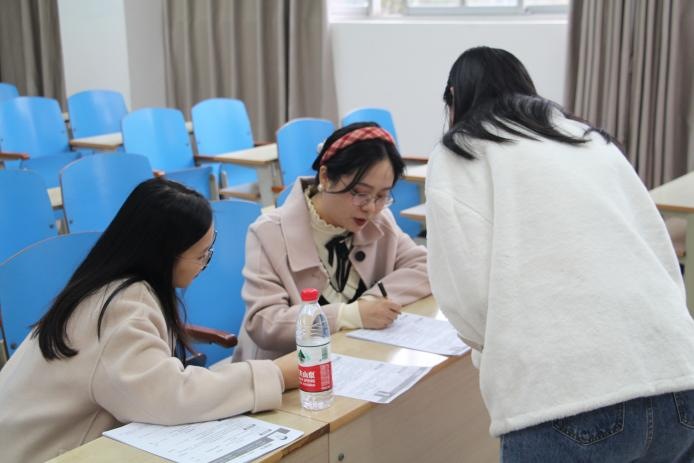 讲座结束后,陈美玲、严潇漪和张佳乐作为面试官分为2组在32教502室、503室进行结构化面试模拟演练。期间,向参与演练的同学传授面试技巧与面试基础知识,并进行总结与指导。