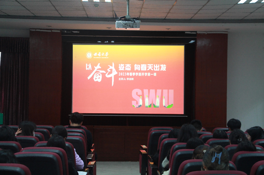 3月3日下午,学校党委书记李旭锋以《以奋斗姿态向春天出发》为题,为全体学子讲授“开学第一课”,从“坚定信心”“挺膺担当”“拔节生长”三个方面寄语青年学子以青春助力中国式现代化,以崭新的姿态拥抱新征程,开启逐梦新篇章。学院全体研究生在书楠楼四楼报告厅共同参加了这场“云课堂”。