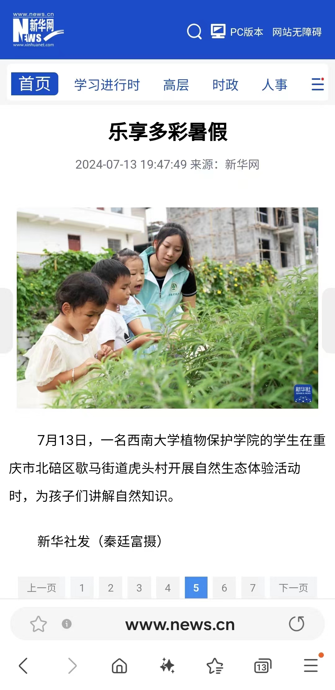7月14日,新华社(新华网)、中国教育报、重庆日报-新重庆等媒体报道我院大学生志愿者赴重庆市北碚区歇马街道虎头村开展暑期社会实践活动。本次活动由PA视讯“厚植”实践队承办,以“大手牵小手,探秘生物多样性”为主题,旨在通过一系列生动有趣的互动活动,激发孩子们对自然界的兴趣和好奇心。同学们借助视频讲解、标本观察、森林漫步等形式,带领山村少年儿童认知动植物,了解昆虫特性,感知自然生态魅力,把保护生物多样性的种子种在孩子们的心里。实践队希望通过实地探索、互动学习和科普教育,培养年轻一代的环境保护意识,加深孩子们对生物多样性的理解,并认识到每个人在维护生态平衡中的重要作用。通过这次活动,同学们不仅传授了知识,还在孩子们心中种下成为未来环保行动者的种子,激励他们为保护地球的绿色未来贡献自己的力量。