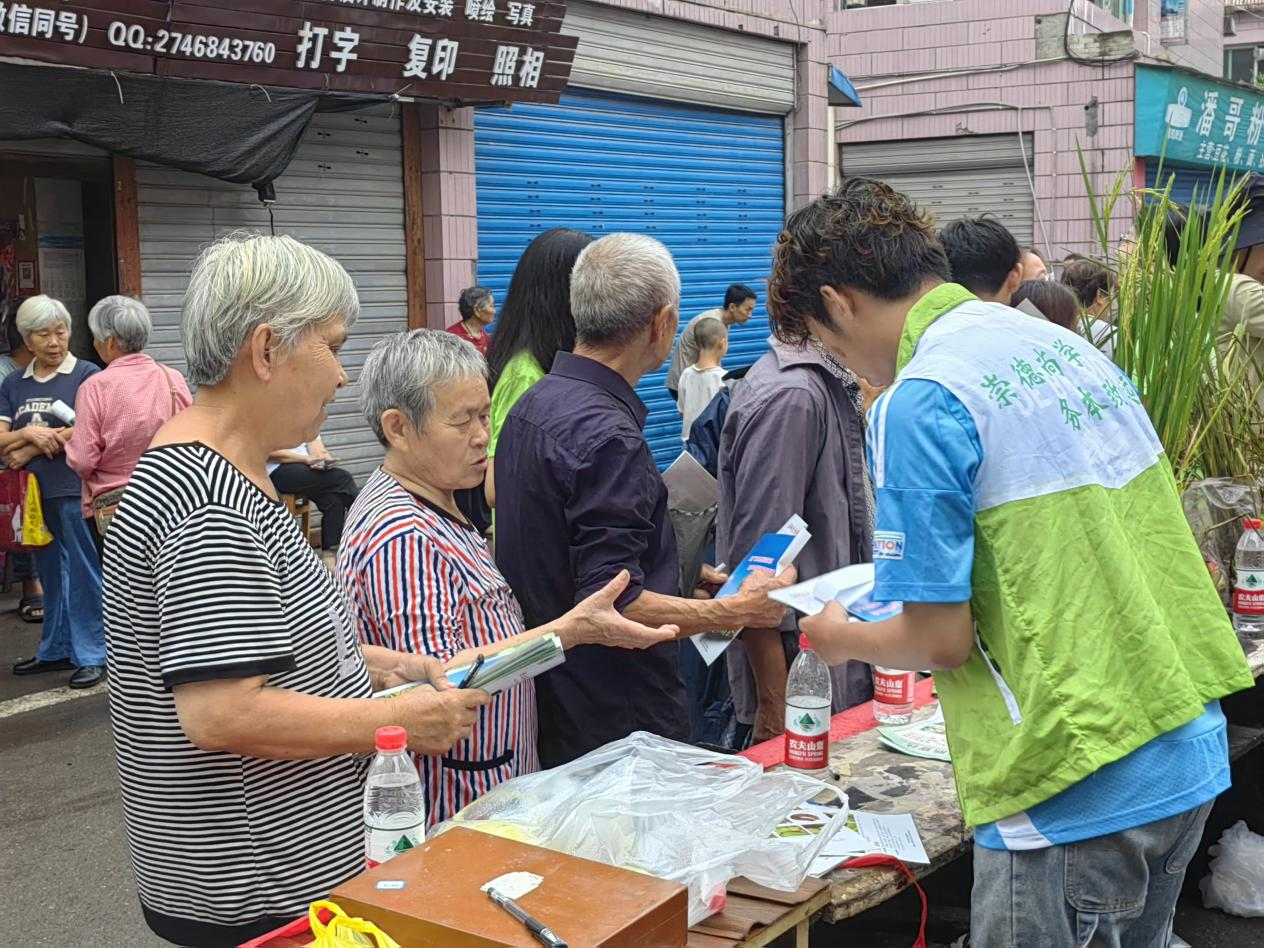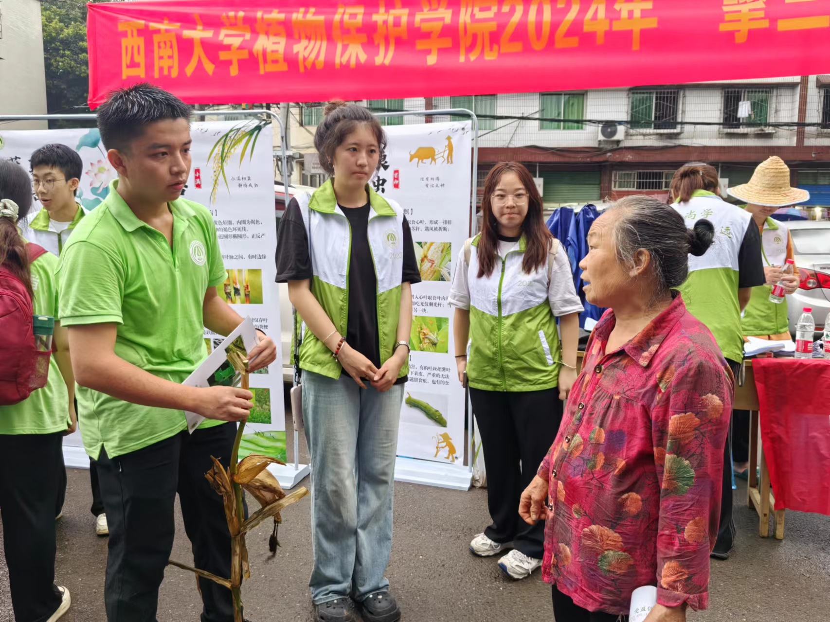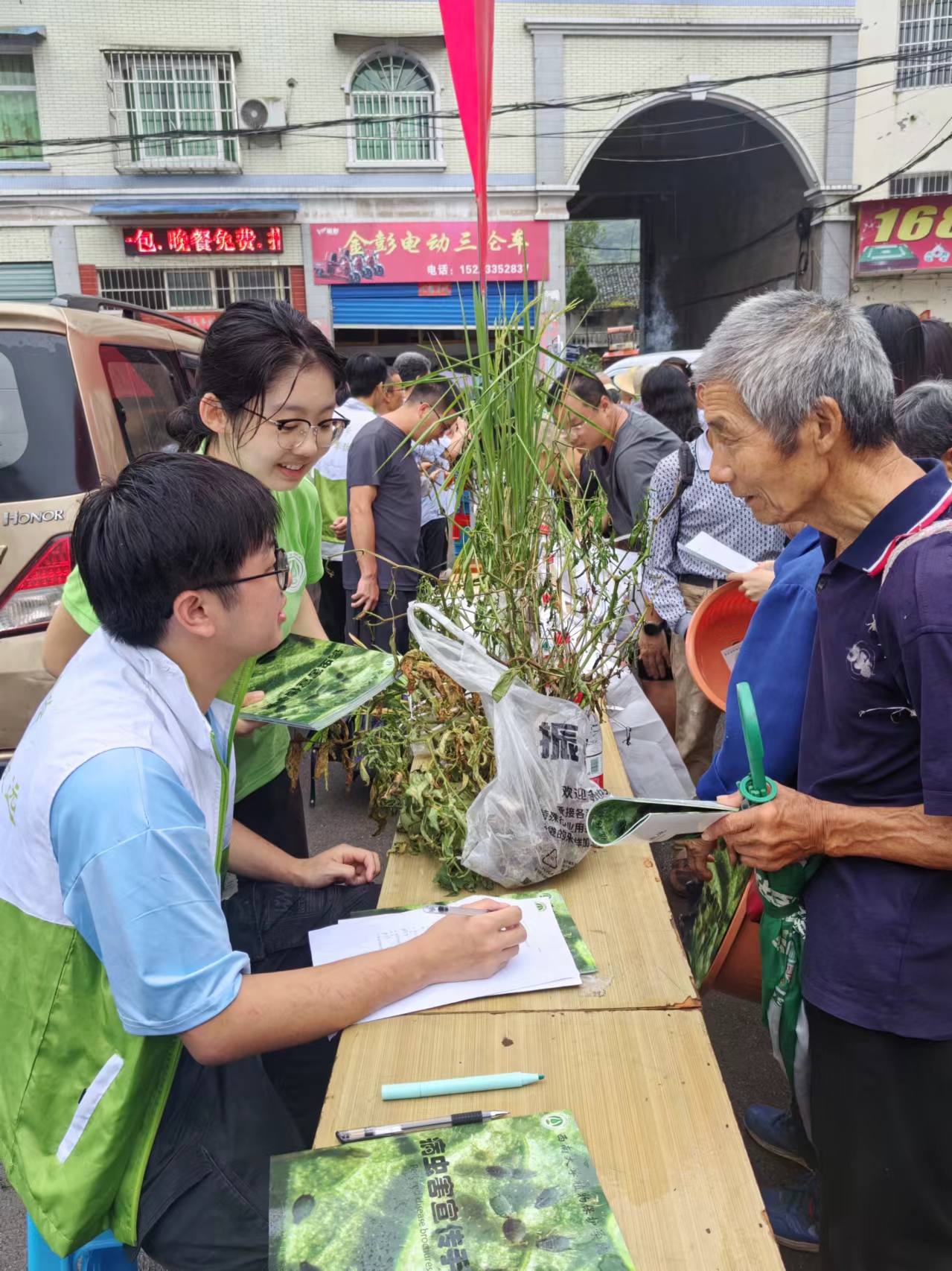 实践队赴铜溪镇科技赶场这天,镇农贸市场人流络绎不绝,队员们把采集到的植物病虫害标本、当地常见病虫害防治知识展架及精心制作的病虫害宣传手册等放置在场镇中心,接受当地农户的咨询。尽管当天天公不作美,下起了绵绵细雨,但展台前来领取宣传资料和咨询农业病虫害知识的群众络绎不绝,队员们主动向赶场群众讲解该地区主要农业病虫害的种类、特征、危害习以及防治手段,一一为他们解答在生产中遇到的众多疑难问题。队员们还深入街头巷尾向农户随机进行了问卷调查,了解他们的秸秆还田情况、土地使用状况,对农业生产中的化学残留及环境污染的认识等等,并进行耐心细致的宣传和讲解相关知识。