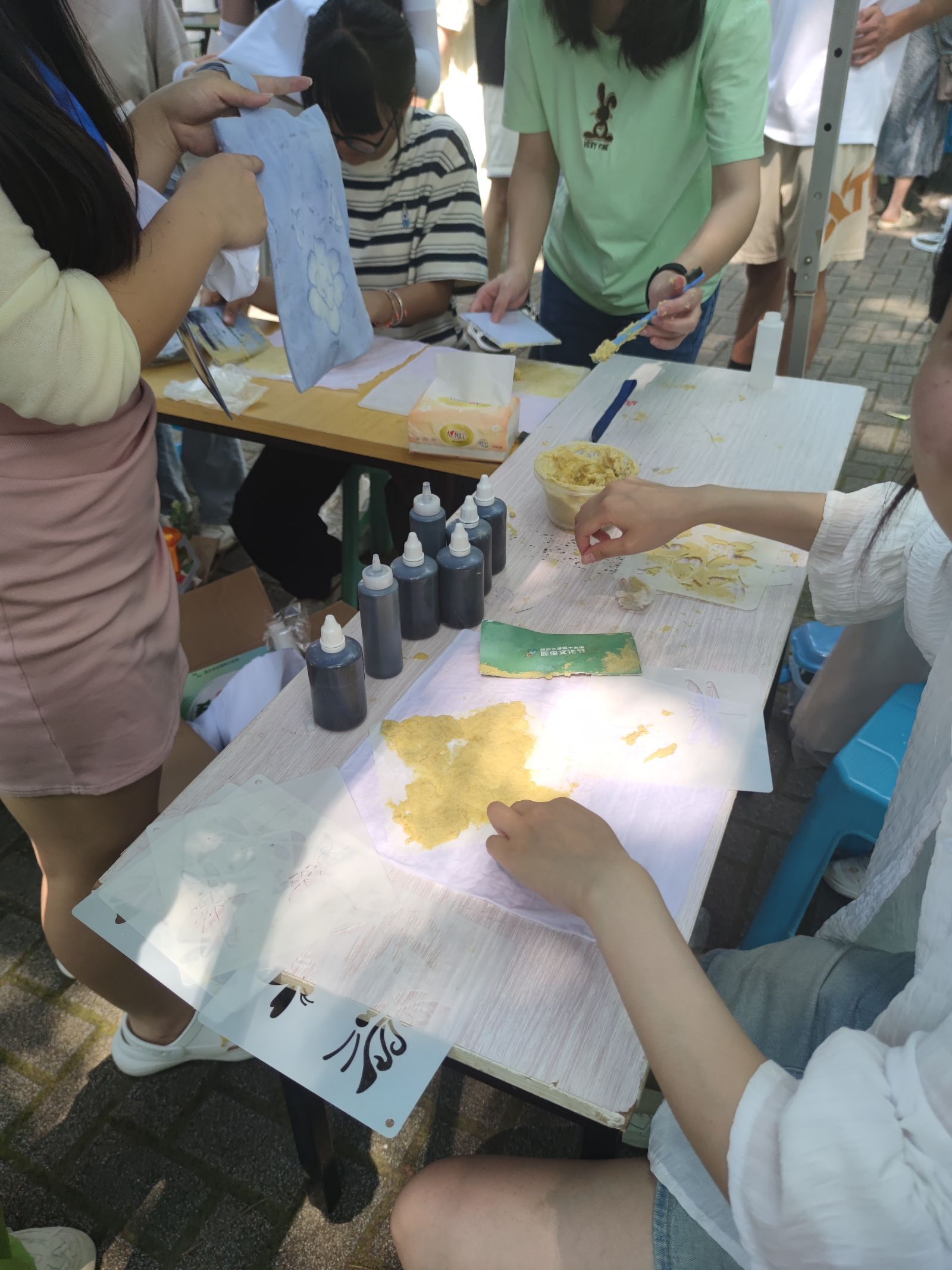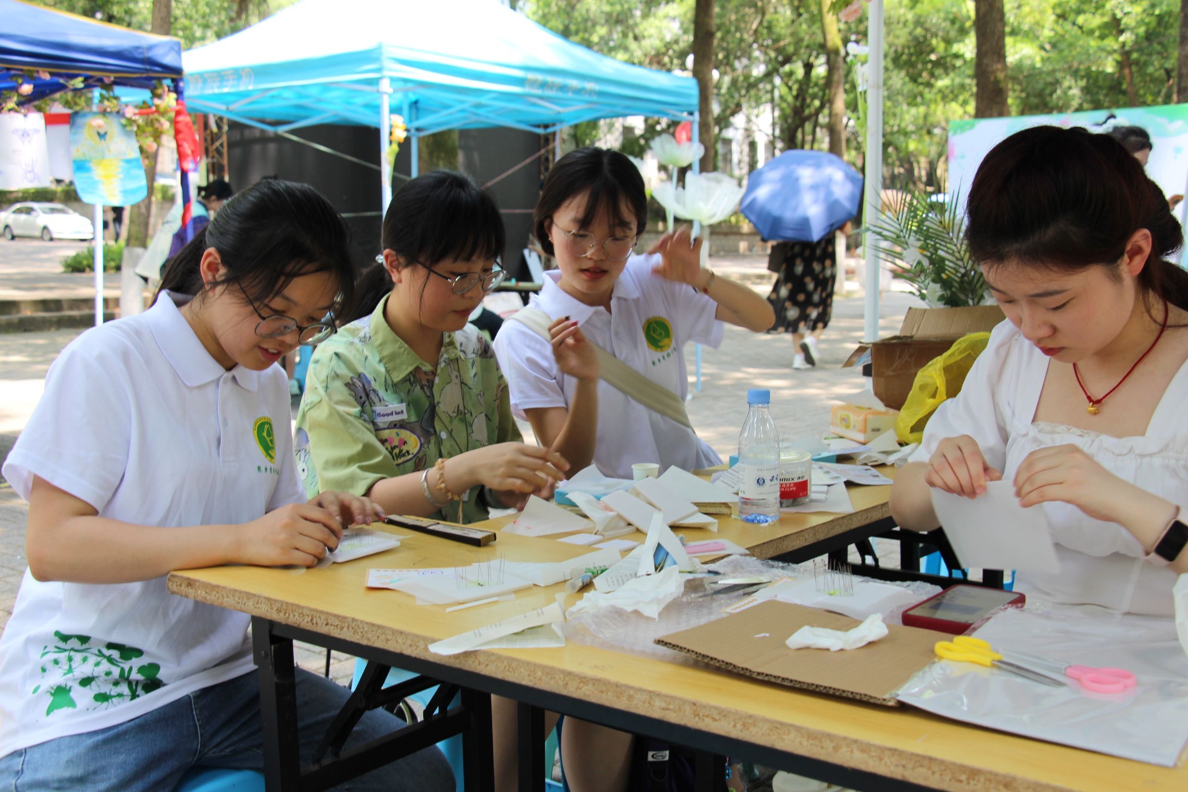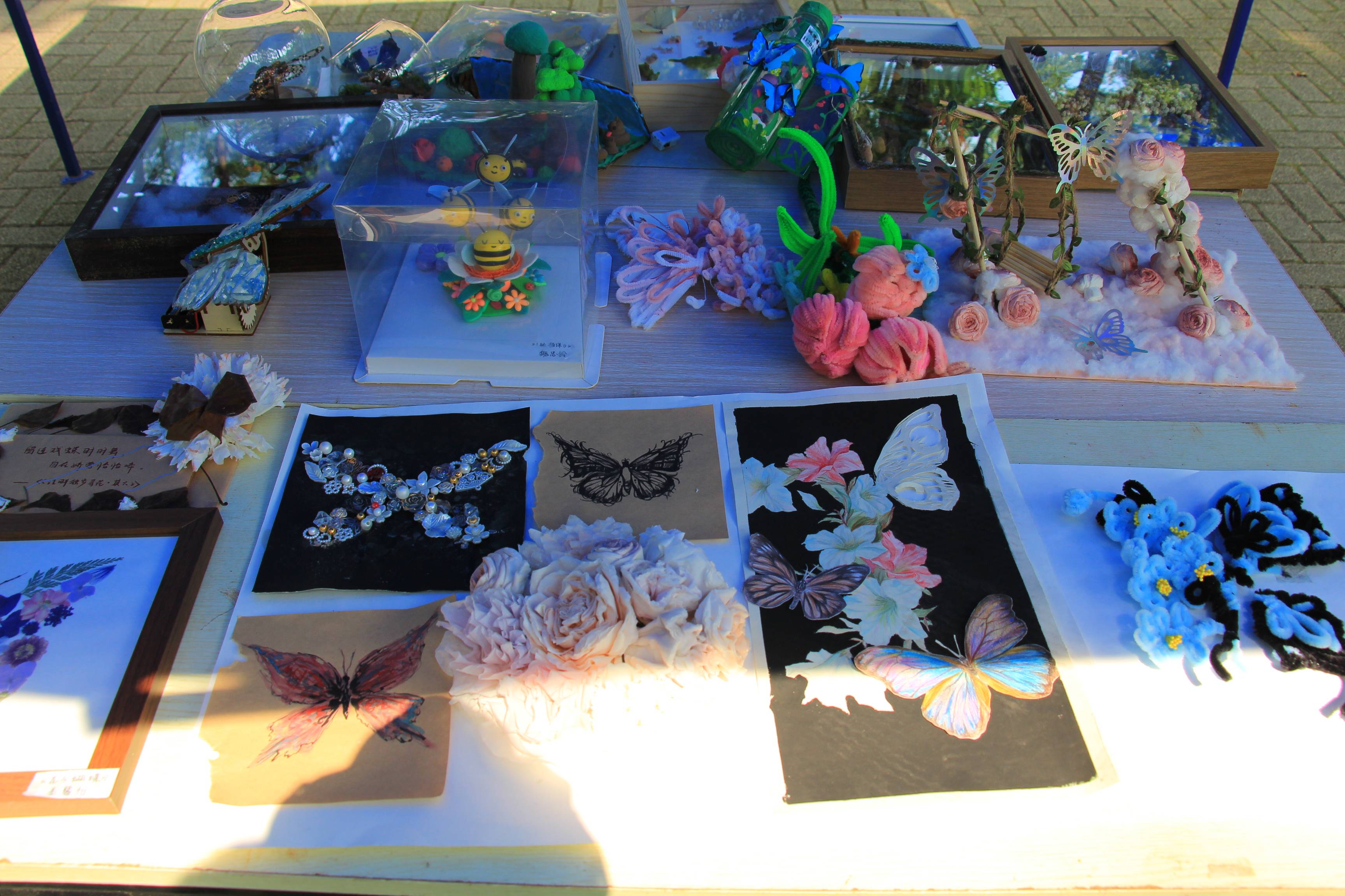 早晨8点,日光已盛,在昆协成员的齐心协力下,昆虫文化节摊位顺利搭好,准备迎接今年的第一位客人。此次摊位共分为四个板块,第一个板块为作品展示区,陈列着众多心灵手巧的同学们制作的昆虫艺术品,那些精美的艺术品总是能吸引到来往的同学,引来阵阵赞叹。第二个板块为小游戏区,无论是昆虫知识问答、限时快嘴,还是昆虫拼图、你画我猜,都能让同学们在欢声笑语中了解到有关昆虫的知识。第三个板块为扎染烫画区,在昆协成员的悉心指导下,一张张绘有美丽图案的布画不断产生自同学们的手下。最后一个板块为蝴蝶标本区,那些蝴蝶在同学们的手中仿佛重新活了过来,展开的翅膀在阳光下反射着炫丽的光芒。