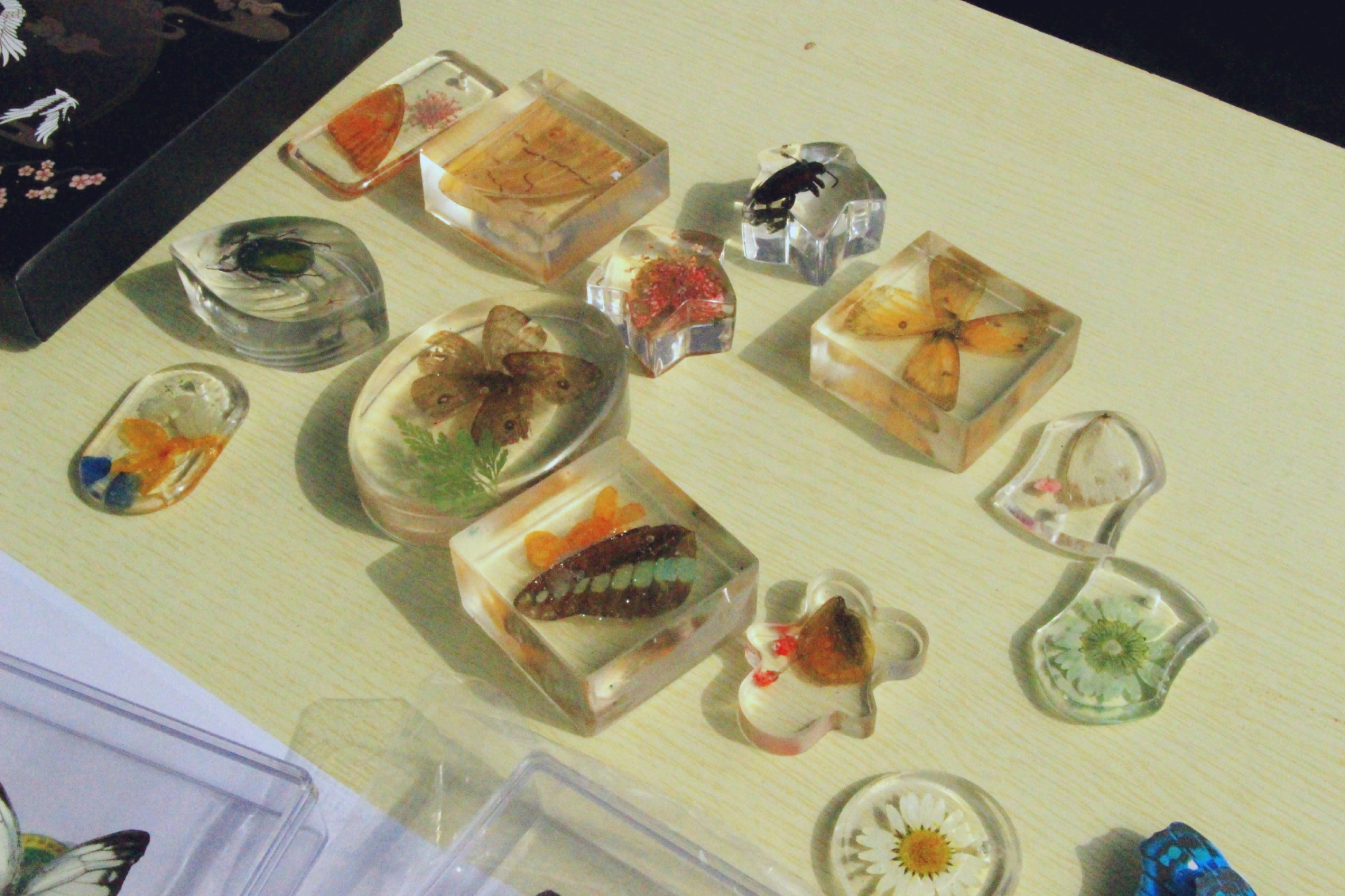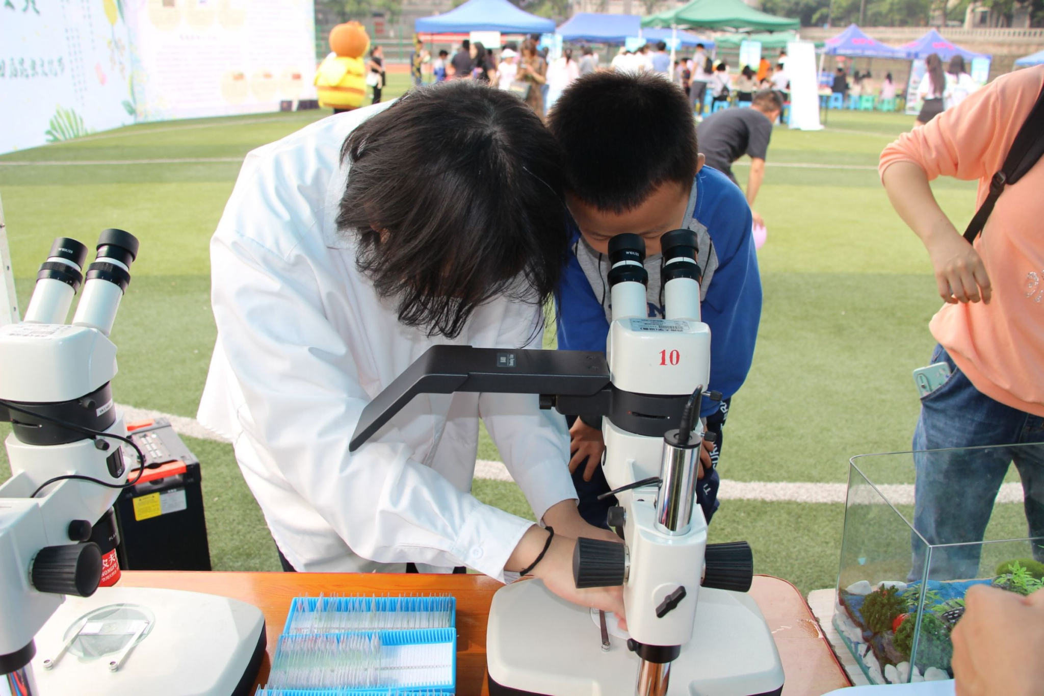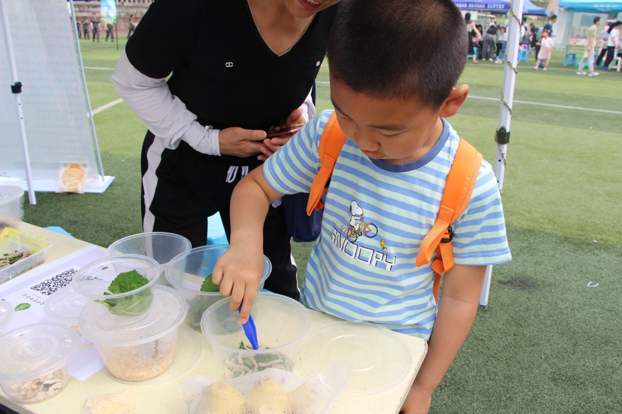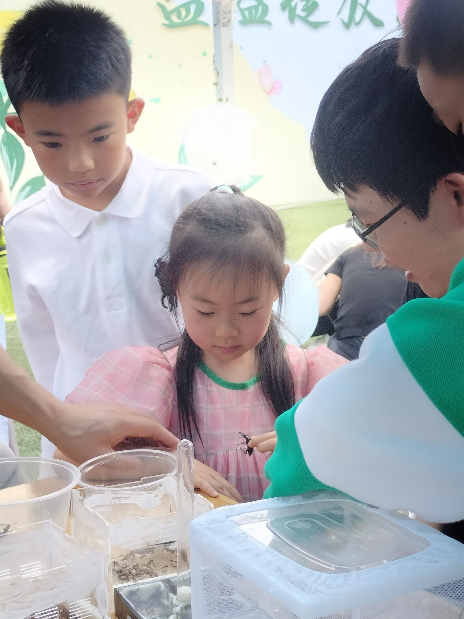 体验区有叶脉书签制作和活虫领养两个区域。在叶脉书签制作中,参与者在工作人员的指引下,将树叶做成了自己喜欢的书签,看到自己DIY的书签成品后,参与者们都露出了满意的笑容。而在活虫领养中,参与者可领养一只蚕宝宝或者小蟋蟀,并扫码加入昆虫饲养观察QQ群。后续工作人员会在群里分享、解答昆虫饲养问题,参与者也可以在群里分享昆虫的每日生活动态。