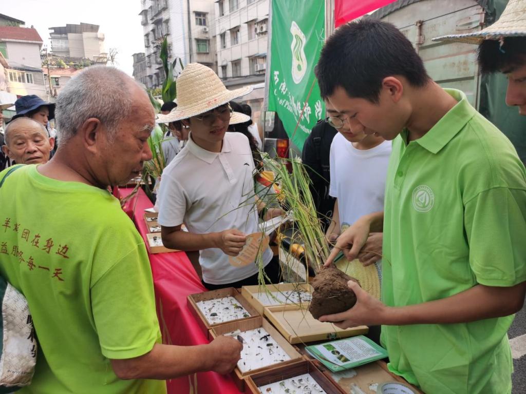 “科技赶场”,心系三农。赶场这天,铜溪镇农贸市场口人头攒动热闹非凡,师生们把采集到的植物病虫害标本、易拉宝、宣传手册以及宣传标语放置在场镇中心,接受当地农户的咨询。展台前来领取宣传资料和咨询农业病虫害知识的群众络绎不绝,院长刘怀教授和师生们主动向赶场群众讲解标本病虫害主要发生种类、危害症状以及防治手段,科普该地区主要农业病虫害的特征及危害习性,一一解答了他们在生产中遇到的众多问题及疑虑。队员们向农户随机进行了问卷调查,了解他们的土地使用状况、对农业生产中的化学残留及环境污染的认识等等,并进行耐心细致的宣传、讲解和解答相关知识。