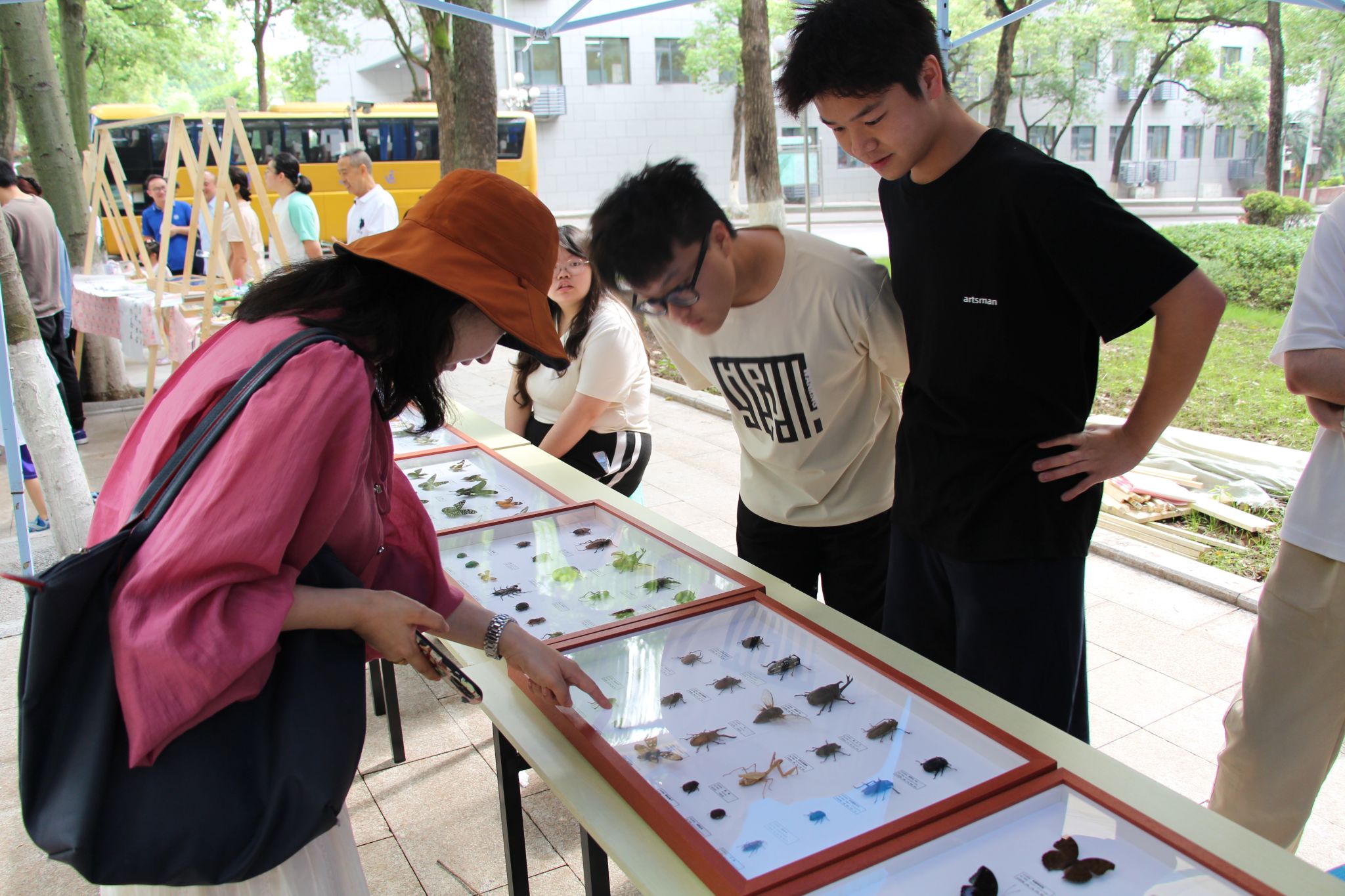 上午9点,昆协和学生会的成员早早搭好了场地以迎接各方来客,在张周飞老师的精彩讲话中,此次昆虫文化节正式拉开了帷幕。恰逢“万物小得盈满”的小满时节,樟树林的浓荫下,虫鸣如碎玉落盘,奏响自然的序曲。活动以“微观视界,人文共生”为核心,将昆虫视为解码自然时序的密钥——它们是科学显微镜下的研究对象,亦是诗画卷轴里的灵动意象。当师生们漫步林间,不仅能透过展板了解检疫性害虫的生态密码,亦能在昆虫标本的玻璃箱前,看见时光凝固的翅脉纹路。主办方以节气为线,将昆虫的生存智慧编织进自然教育的网络,让樟树林成为一本立体的生态教科书,等待每双好奇的眼睛去翻阅。