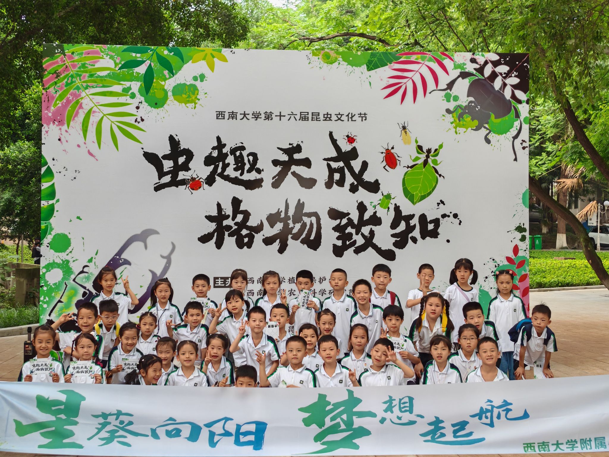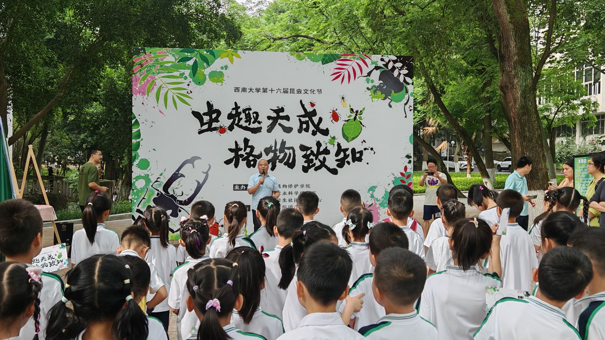 当小满的风掠过樟树林的叶隙,翅翼振动的微响与节气的韵律同频共振。5月24日,西南大学南区樟树林化身为一座流动的昆虫博物馆,第十六届昆虫文化节以“虫趣天成,格物致知”为笔,在自然与人文的交汇处,书写出一场关于生命哲思的诗意盛会。这场由PA视讯、西南大学农业科学研究院、西南大学学生社团服务中心主办,西南大学昆虫爱好者协会与PA视讯团委学生会承办的文化盛宴,串联起科普的严谨、艺术的灵韵与互动的趣致,让参与者在草木芬芳间,倾听昆虫谱写的自然诗篇。