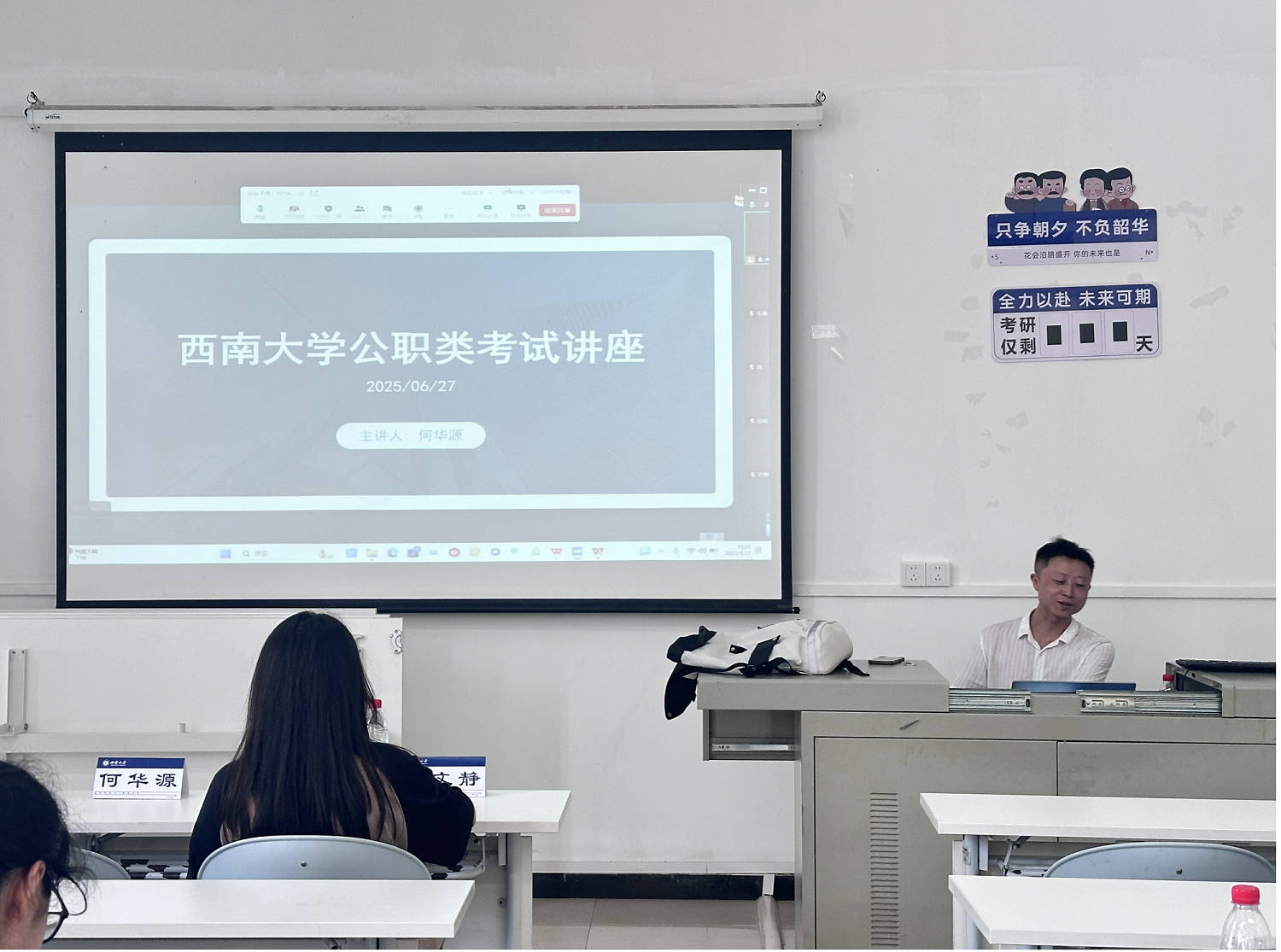 为加强学院学生对公职类相关考试的了解,锻炼学生的应试能力,6月27日下午,学院在36教309室举办了公职类考试讲座。本次活动特邀资深公考培训专家何华源主讲,咨询老师瞿颖、李文静和学院部分研究生和本科生参加了本次活动。讲座由2024级研究生陈品璐主持。