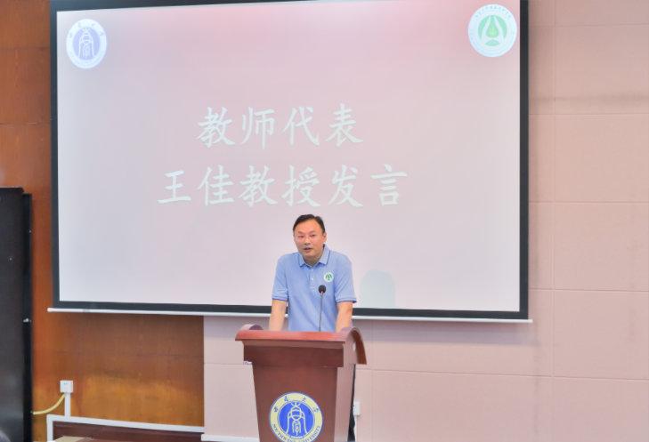 教师代表王佳教授在发言中勉励新生迅速适应大学生活,实现从被动学习到主动探索、从盲目学习到目标驱动、从个人奋斗到团队协作的三大转变。他期望同学们夯实基础知识,勇于挑战未知领域,厚植家国情怀,培养深厚的人文素养。