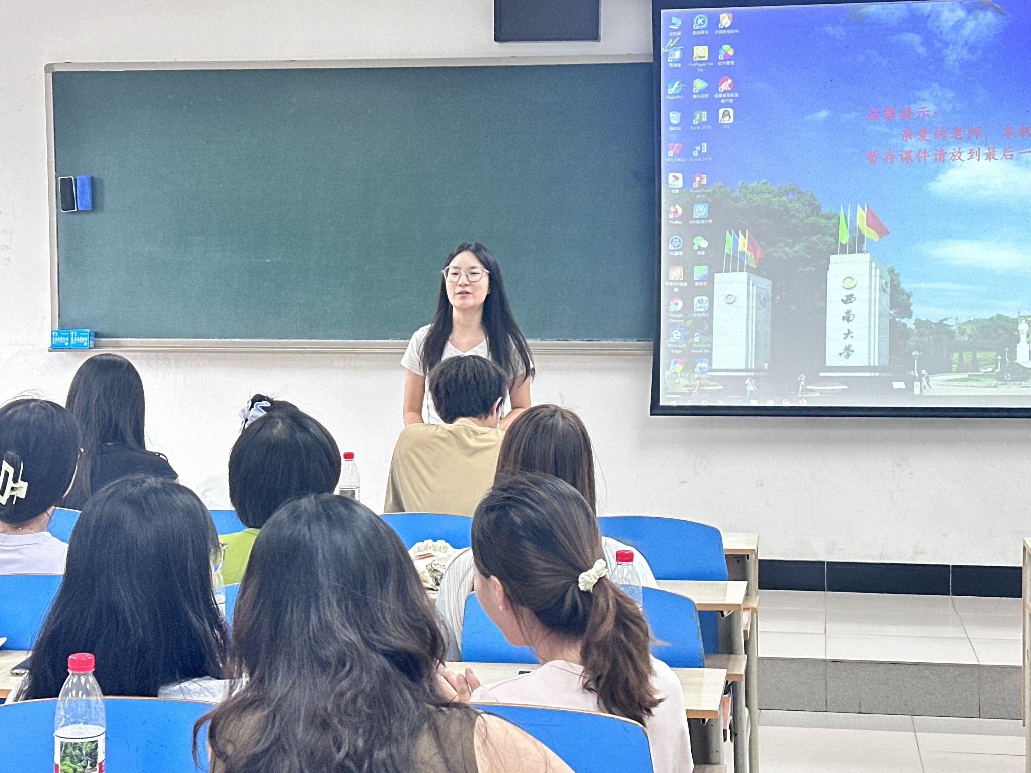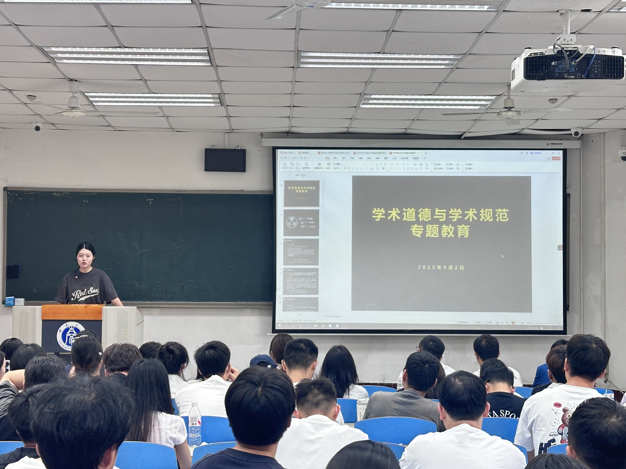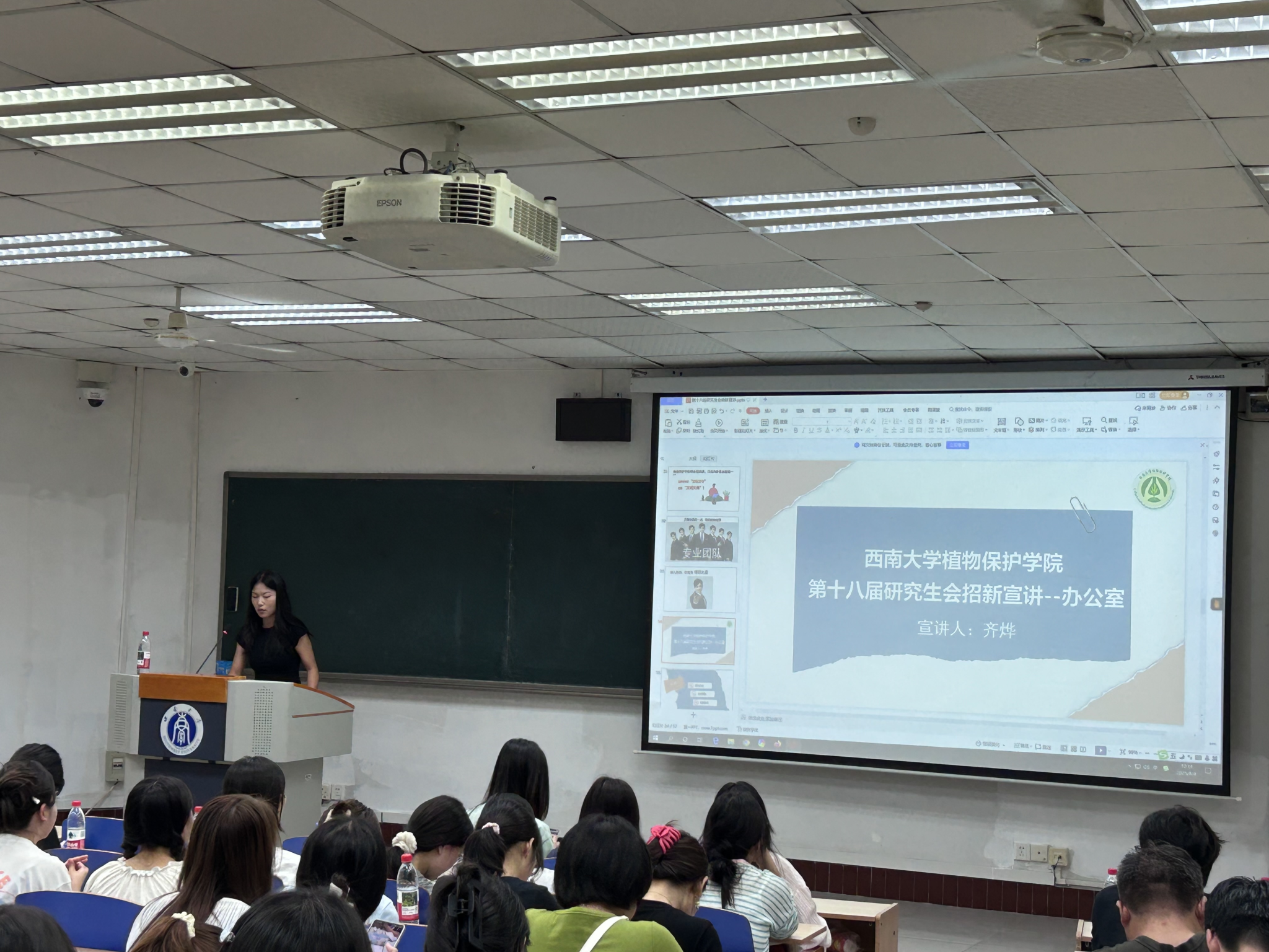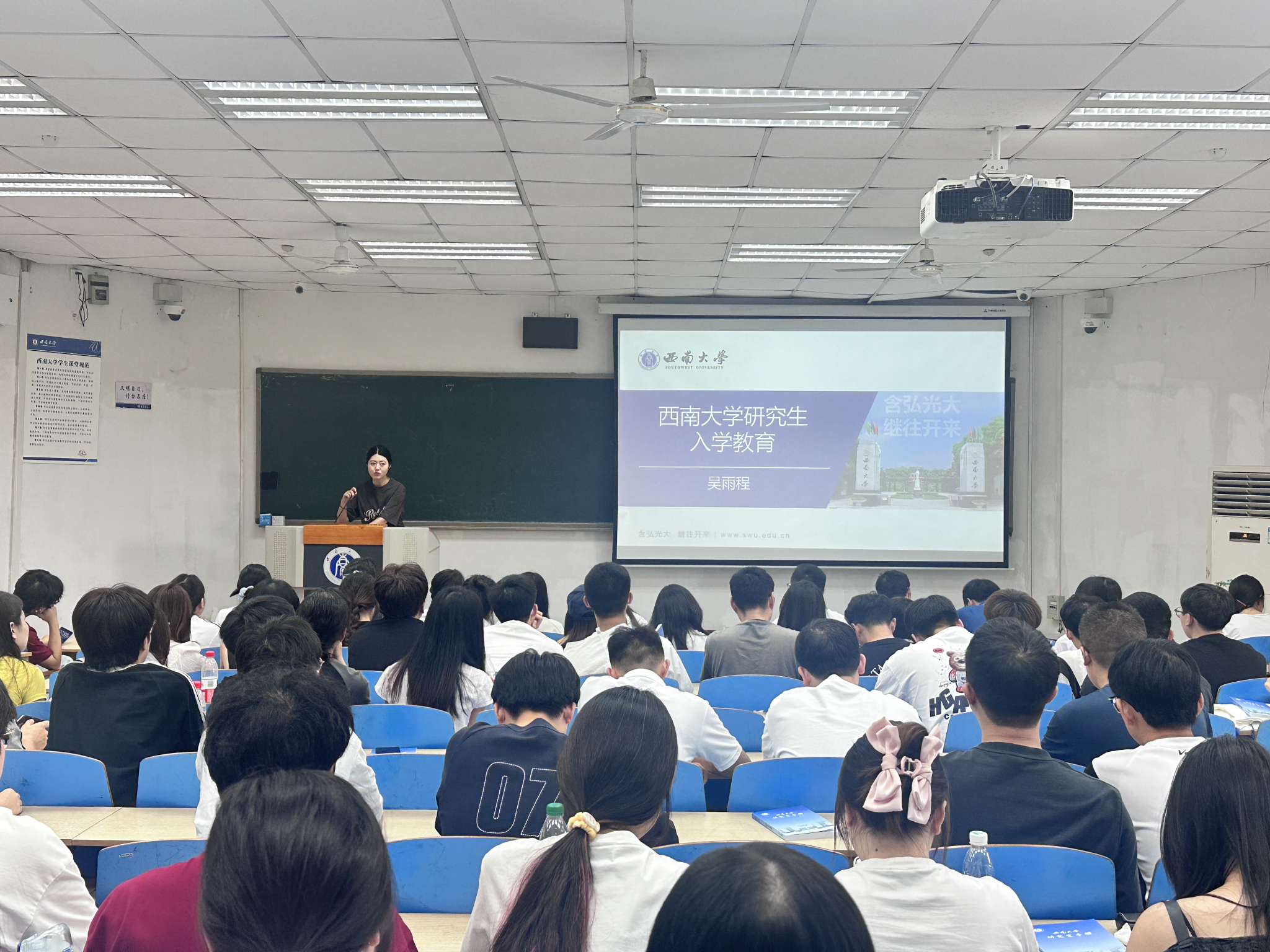首先,严老师带领同学们学习西南大学章程,了解西大精神。随后,她详细介绍了学校、学院奖助学金体系、研究生手册。最后,吴老师接续讲解学院研究生管理与培养环节,比如选课系统操作、研究生管理系统的使用等,并现场演示研究生管理系统的使用方法,确保新生能熟练运用平台完成学业相关操作。吴老师还重点解析了研究生培养过程中的学分要求、中期考核标准、论文盲审流程等关键制度。期间,她还进行了学术道德与学术规范专题教育,强调研究生在追求学术创新的同时须恪守学术道德,遵守学术规范,营造良好的学术生态。