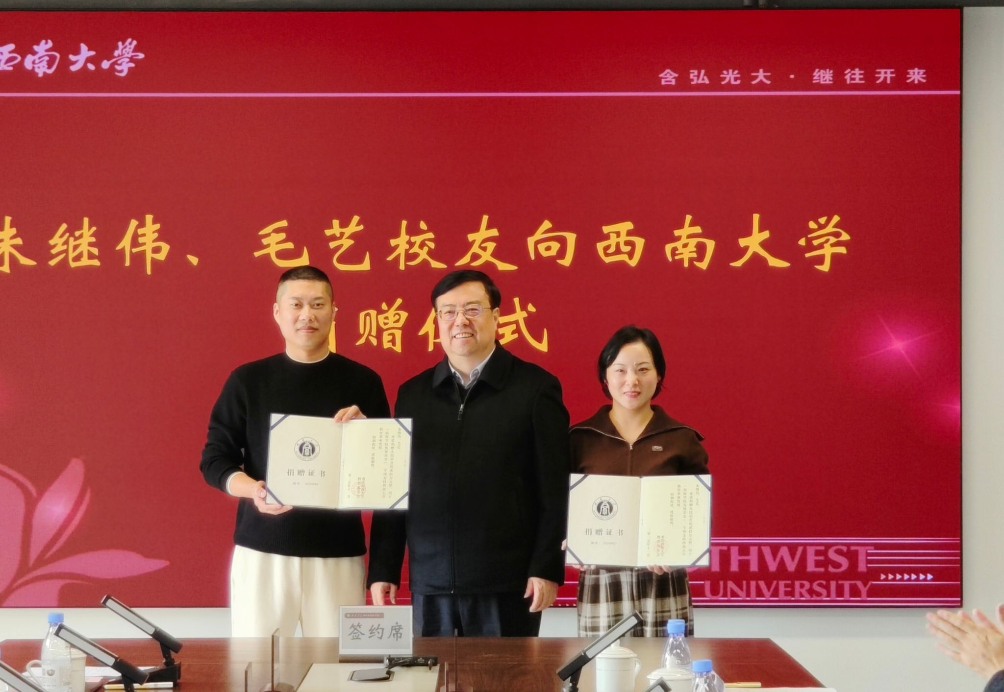 仪式上,学院1992级校友、天津市汉邦植物保护剂有限责任公司董事长叶进刚,及同届校友、广东真格生物科技有限公司董事长王泊理向学校联合捐赠120万元;四川恒嘉能源集团有限公司总经理、学院2001级校友朱继伟,美术学院2006级硕士校友毛艺捐赠120万元,以支持学院学科建设发展与拔尖人才培养,共庆母校120周年华诞。