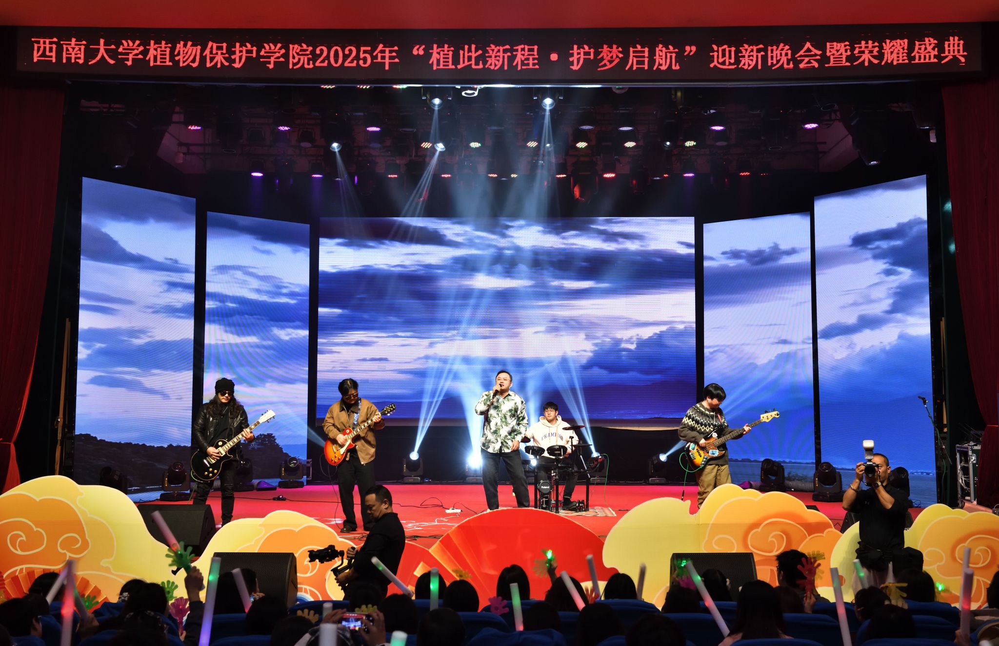 在榜样力量的感召下,晚会进入师生携手、共赴未来的华彩篇章。硕士生导师王佳老师与硕士生代表组成的乐队献唱《不再犹豫》,激昂的旋律震撼全场,展现了师生亦师亦友、共同奋进的深厚情谊与科研路上的坚定决心;学院团委学生会的集体舞《我的未来式》,跳出了青春的自信与对明天的无限憧憬;艺术团演绎的情景剧《希望的田野》,深情讲述了植保人扎根大地、守护粮安的初心故事,引发全体师生强烈的专业认同感与使命感;教授们带来的舞蹈《漫步人生路》优雅从容,展现了学术之外的豁达姿态,为学生带来关于成长与生活的深刻启迪。