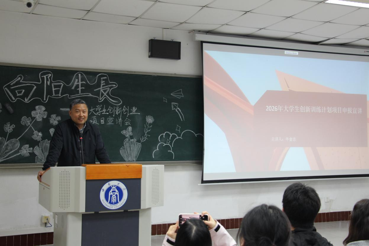 宣讲会上,牛金志教授围绕大创项目进行系统全面的政策解读,从项目定义、核心目标、分类分级入手,清晰讲解创新训练、创业训练、创业实践三类项目的定位,详细拆解校级、市级、国家级项目的差异化要求与结题标准,并强调了大创项目在深化专业认知、积累竞争优势、提升综合能力、链接导师资源等方面的重要价值。同时,他还结合自身指导学生参与大创项目的经历,生动展示了学生在大创项目中成长成才的全过程。