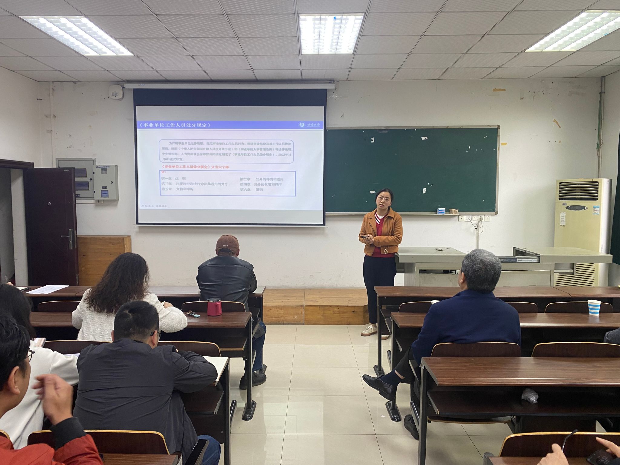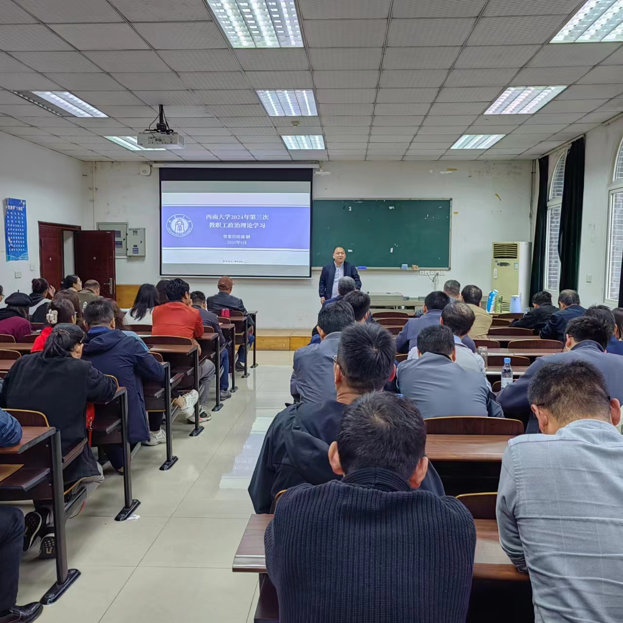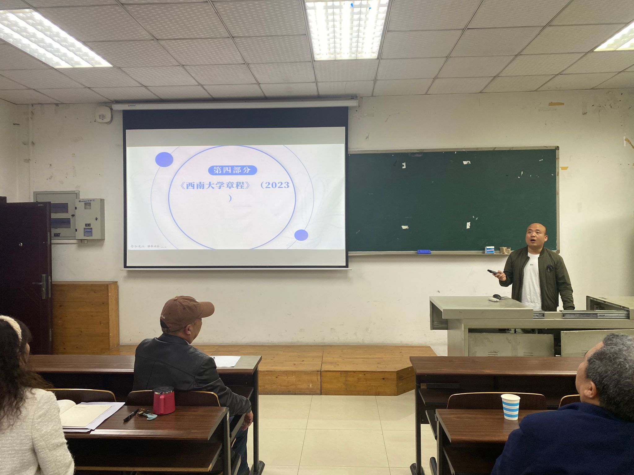 会议分两个阶段进行。第一阶段是全院教职工集中学习。副院长蒋红波带领老师们学习了习近平总书记在2024年春季学期中央党校(国家行政学院)中青年干部培训班开班之际作出的重要指示精神,副院长青玲领学《中华人民共和国保守国家秘密法》,教工一支部书记李竹领学《事业单位工作人员处分规定》,党委委员张周飞领学《西南大学章程》(2023)。
