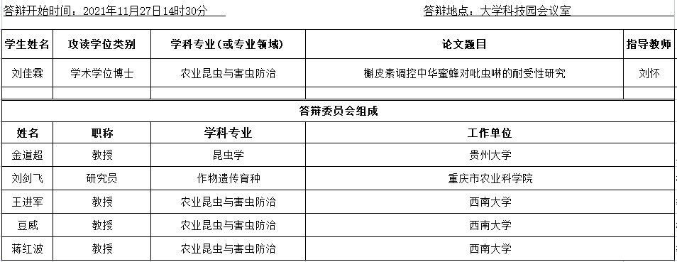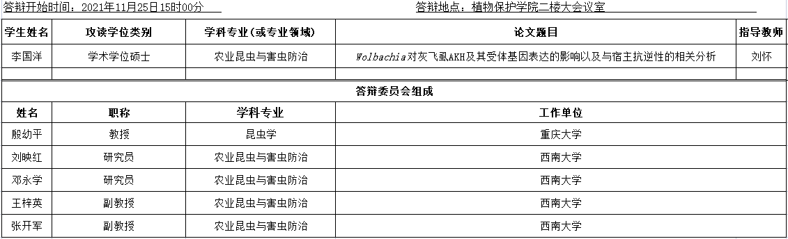 PA视讯农业昆虫与害虫防治专业2021年秋季学期学位论文答辩安排公告
